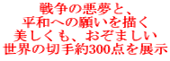 アウシュビッツに代表されるナチスの大罪、イラン・イラク戦争、核兵器廃絶を願う世界の人びとの叫びなど、世界各国で発行している約300点の貴重な切手を通して、戦争と平和を考えます。 | |